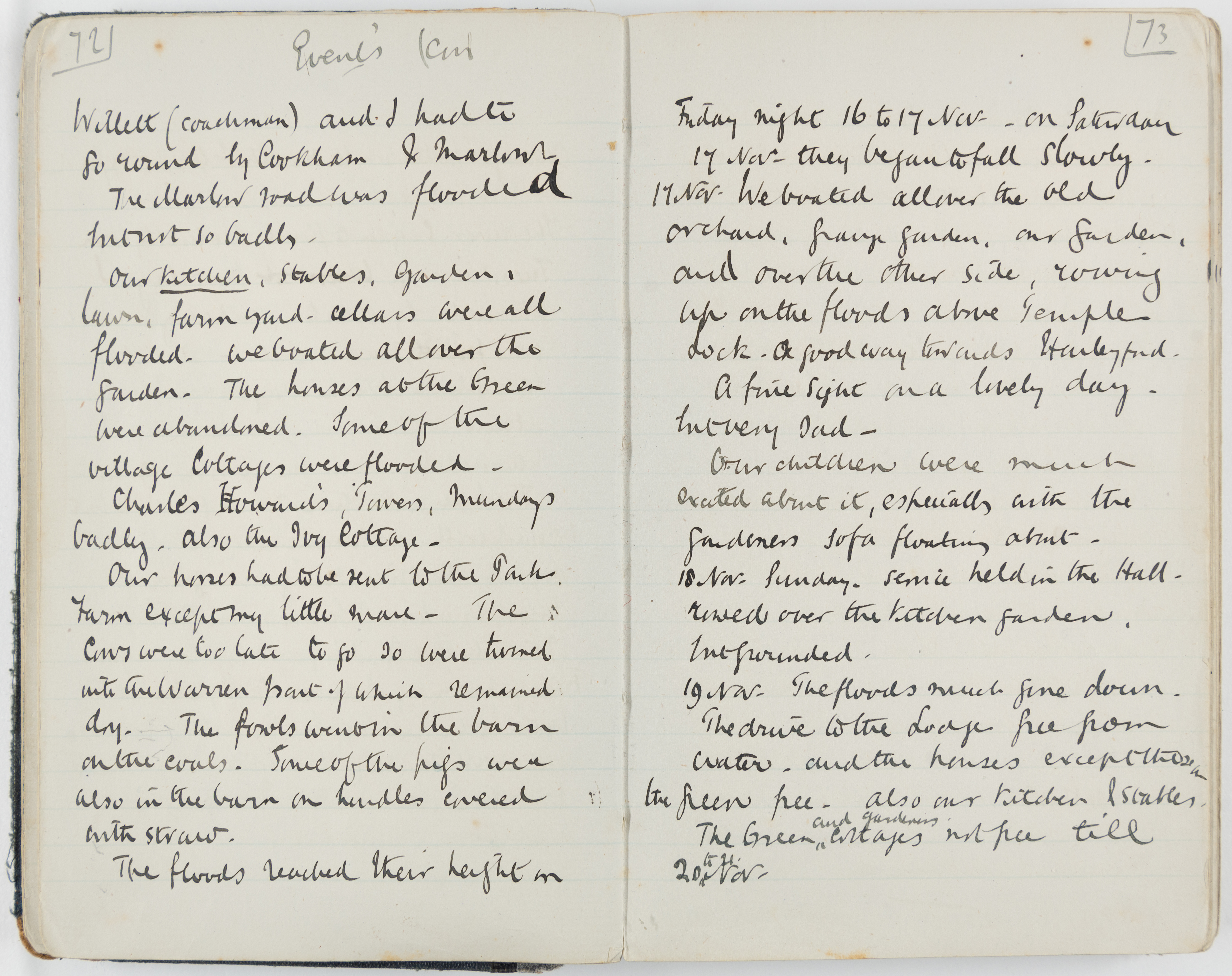 ‘17 Nov. We boated all over the old orchard, Grange garden, our garden, and all over the other side, rowing up the floods toward the Temple Lock . A fine sight and a lovely day – but very sad. Our children were much excited about it, especially with the gardeners sofa floating about.’
