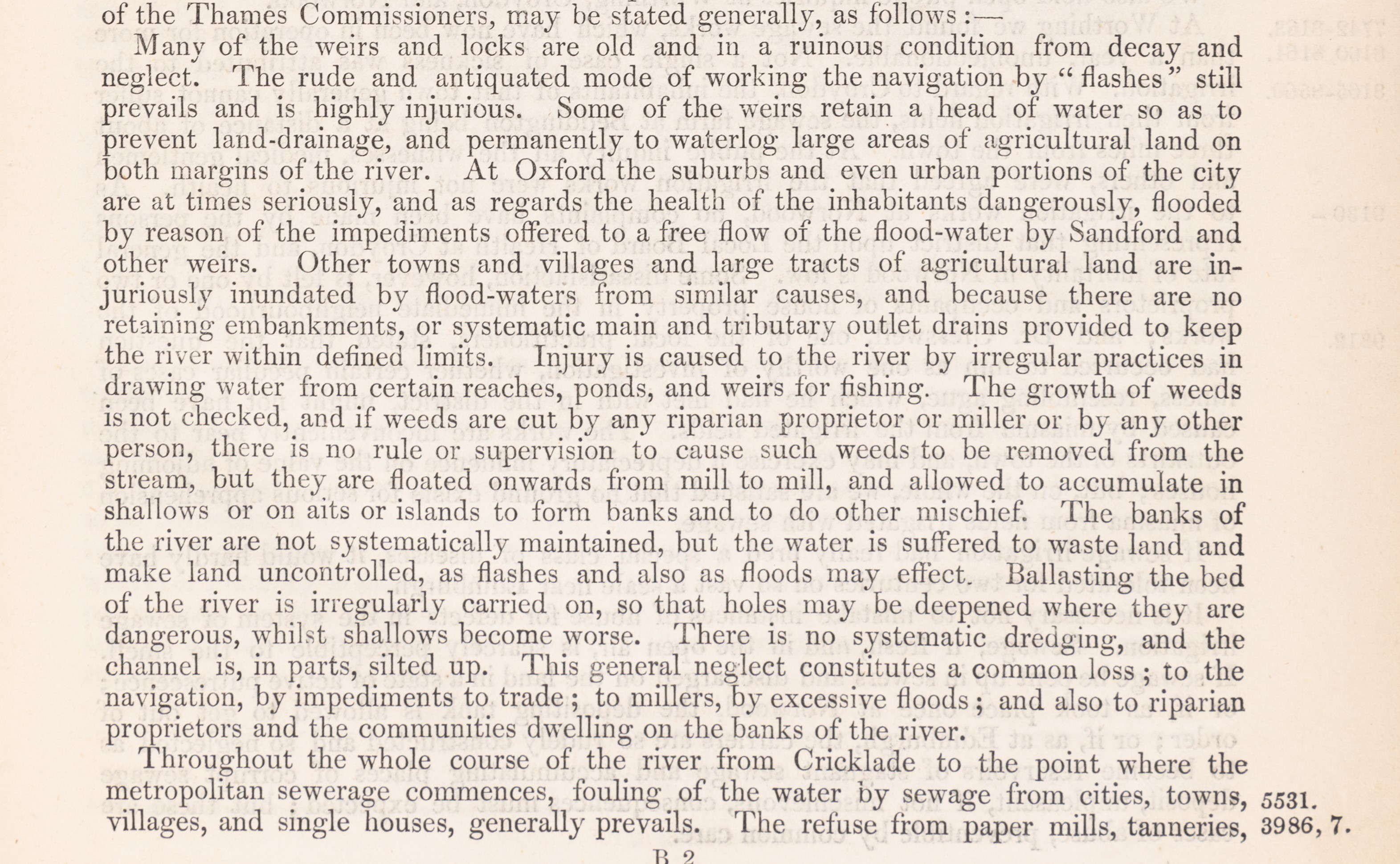 ‘Some of the weirs retain a head of water so as to prevent land-drainage, and permanently to waterlog large areas of agricultural land on both margins of the river. At Oxford the suburbs and even urban portions of the city are at times seriously, and as regards the health of the inhabitants dangerously, flooded by reason of the impediments offered to a free flow of the flood-water by Sandford and other weirs. Other towns and villages and large tracts of agricultural land are injuriously inundated by flood-water from similar causes, and because there are no retaining embankments, or systematic main and tributary outlet drains provided to keep the river within defined limits’.