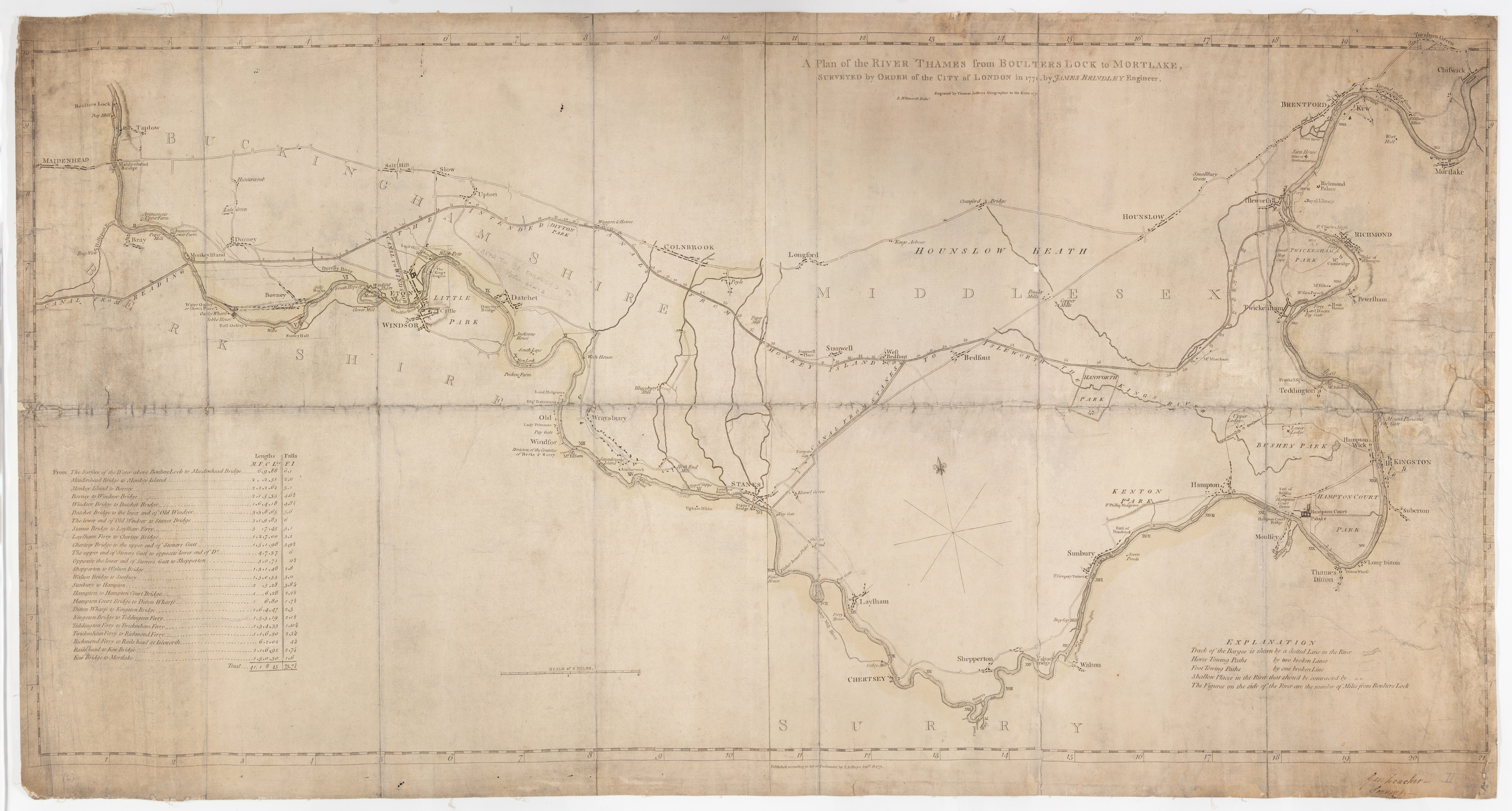 By 1770 the river’s condition was seriously hampering trade. It was claimed that you could not travel the Thames in winter due to flooding and in the summer due to shallow water. The City of London commissioned canal engineer James Brindley to survey the river between Boulter’s Lock and Mortlake, and he concluded that the obstructions to navigation were ‘considerable and many’.