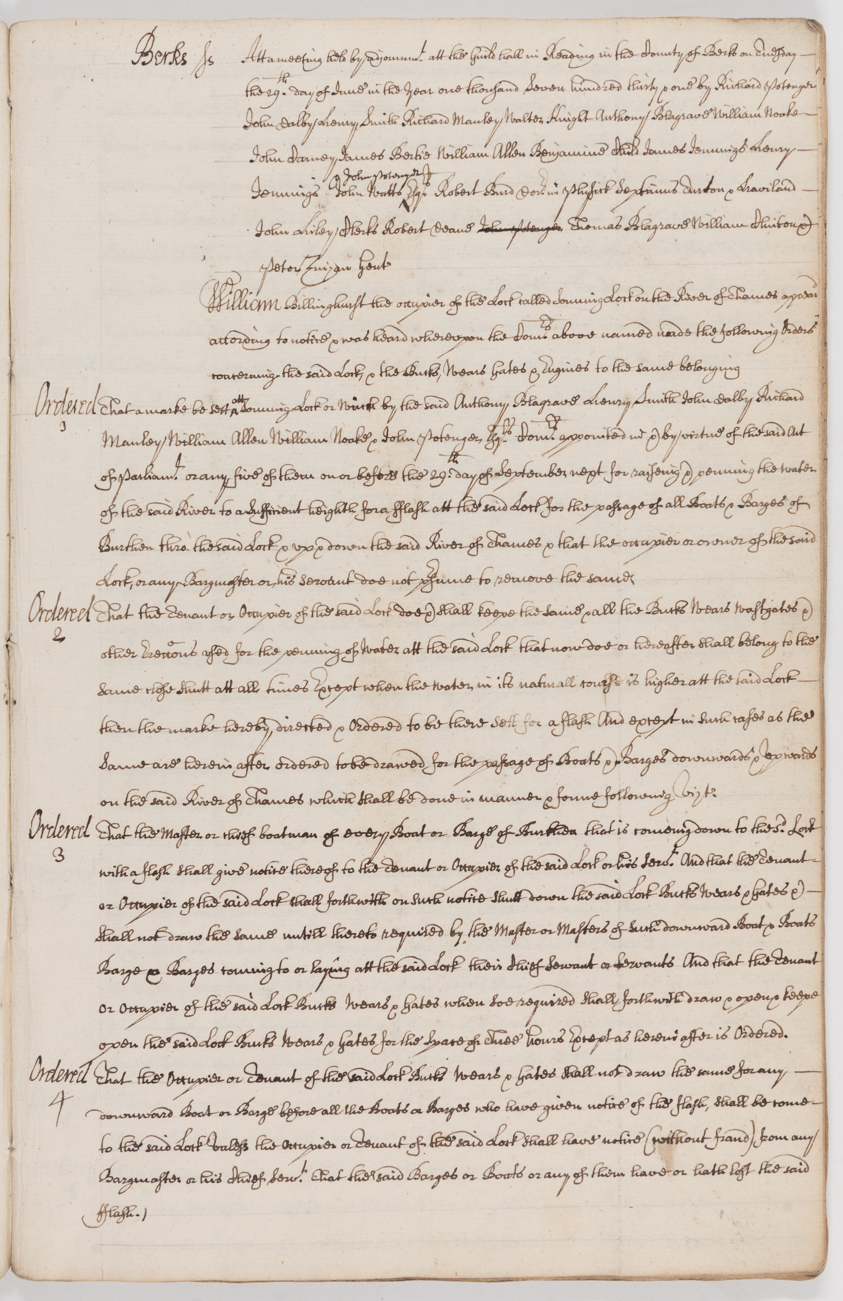 Many barge owners made their living on the river. When bargeman William Raynolds of New Windsor died in 1598 he left his half of ‘the Barge uppon the Thames called the Diana .. and half the tackell to hir’ to his wife Margaret. His inventory values his share in the barge at £4. D/A1/111/121